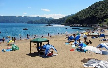 <2025年シーズンの海水浴場は閉鎖>百人一首にも詠まれた田烏(たがらす)にある浜で、静かな佇まいと、澄んだ海をめざして訪れる観光客が多い。二条院讃岐姫の歌「わが袖は 潮干に見えぬ 沖の石の 人こそ知らね 乾く間もなし」は、田烏の西側にある五所平という高台から沖の石を望み、自らの悲恋を託したと伝わる。田烏からほど近い大浜には、「国立若狭湾少年自然の家」があり、子どもたちがカッターや水泳、アスレチックなどを楽しめる。