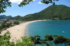 真っ白な砂浜とエメラルドグリーンの海が魅力の、香住で最も砂浜が広い海水浴場。山に囲まれているため波が穏やかで、岩場では磯遊びや海の生きものを観察することもできる。ビーチのそばには民宿が軒を連ね、佐津温泉の源泉を引いている宿も多い。ファミリー客のほか、臨海学校やサークルの合宿所としても人気。
