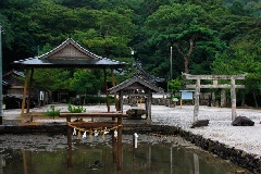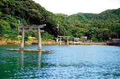 彦火火出見尊(ひこほほでみのみこと)と豊玉姫命(とよたまひめのみこと)を祭る海宮で、大陸航路の要衝であった対馬の歴史を物語る史跡。本殿正面より海へと向かって続く5つの鳥居が特徴的で、外側のふたつは海中に立ち、満潮時にはまるで海に浮かんでいるような神秘的な光景が広がる。一方、社殿の裏手は深い森に覆われ、遊歩道が整備されており、散策が楽しめる。