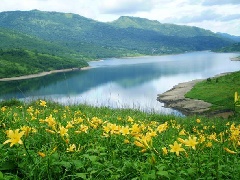 “天空の湖”と称される野反湖は、2000m級の山々に囲まれた上信越高原国立公園内の標高1500mに位置し、信濃川水系中津川の水源となる周囲約12kmのダム湖。イワナ、ニジマス釣りやバードウォッチングといったアウトドアが多彩に楽しめる。初夏から秋にかけて、ノゾリキスゲ、レンゲツツジ、コマクサなど、300種類以上の高山植物が湖畔を彩り、登山コースとしても人気。キャンプ場があり、満天の星空を目当てに来る観光客も多い。