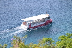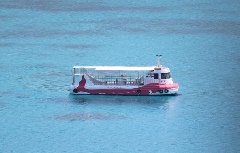 奄美大島と加計呂麻島にはさまれた大島海峡を巡る水中観光船。船室は、海中に出ている半潜水船で、200種とも言われる多種多様なサンゴ礁や、そこに生息するカラフルな熱帯魚を間近に水中観察することができるのが魅力。古仁屋港から海中ポイントまでの往復時は、デッキから美しいリアス式海岸の景色を楽しめる。奄美大島は、2021年7月、「奄美大島、徳之島、沖縄島北部及び西表島」の一つとして世界自然遺産に登録された。