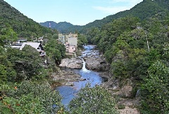 奥三河、鳳来寺山の東麓の宇連川沿いに、宿が建ち並ぶ湯谷温泉。奥三河を代表する温泉で、約1300年前に鳳来寺の開祖、利修仙人によって開湯されたといわれている。湯量は豊富で、ジムも併設した共同浴場のほか、温泉スタンドもある。宇連川が上流に切りたつ「鳳来峡」と、川底が板を敷き詰めたように見える「板敷川」は、まさに風光明媚。