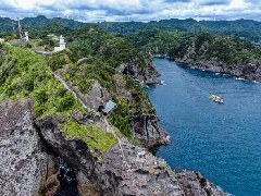 伊豆半島最南端の岬で、相模湾と遠州灘の怒濤を受ける絶壁。大海原を見おろす白亜の石廊埼灯台、海の安全を見守る石室神社、縁結びの熊野神社がある。海に突き出た展望所もあり、伊豆七島の眺望が絶景。遊覧船での石廊崎めぐりも人気。