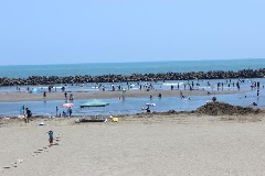 遠浅の海が特徴の海水浴場。沖合いには、消波ブロックが設置されているため、波が穏やかで、家族連れでも安心。県内はもとより、西日本でも有名なサーフポイントがあり、地元や県内からのサーファーで1年中賑わう。海岸一帯は、県指定の天然記念物であるアカウミガメの産卵地としても知られる。平成18年(2006年)には、環境省選定の「快水浴場百選」に選ばれた。付近は、良質の天然牡蠣の漁場でもあり水質も良好。キャンプ村も隣接している。サーフィンやボディボードなどのマリンスポーツも楽しめる。