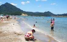 広い階段になっているので、砂が少なく休みやすいビーチ。磯遊びができる岩場があり、ほどよい広さのビーチなので、小さな子ども連れにもおすすめ。海水浴場開設期間のみ、砂浜全域でバーベキューができるのも魅力のひとつ。