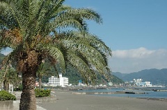 伊東の温泉街から歩いて行けるアクセス抜群の海水浴場。フェニックスが風に揺れ、南…