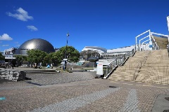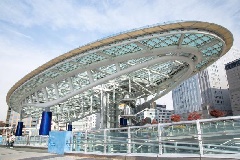 空中に浮かぶ水をたたえたガラスの大屋根「水の宇宙船」がシンボルの立体型公園。芝…