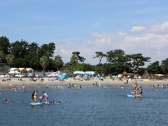 日間賀島の東部にある海水浴場。美しい朝日の姿を楽しめる。例年、夏にはさまざまな…