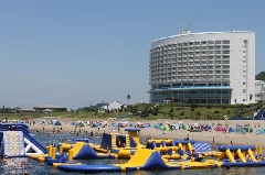 伊良湖港に隣接する南国ムードいっぱいのビーチ。カラフルなパラソルがビーチを彩り…
