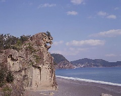 海岸の隆起と海蝕現象によってうまれた奇岩で、高さ25m、周囲210mの巨岩が熊…
