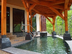 宿は木と白壁の民芸風のたたずまいで、風呂は檜造り。天候により、乳白色の湯色が変…