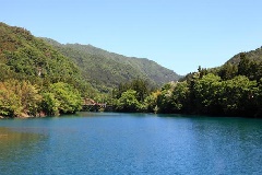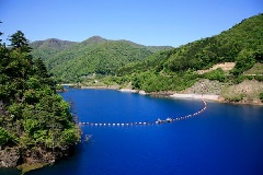 四万湖の約10km上流に位置する奥四万湖。四万湖・奥四万湖ともダム湖で、太陽光…