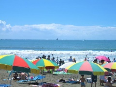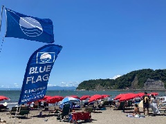 正面に「えぼし岩」、東に「江の島」、西に「富士山」を望む、風光明媚な海水浴場。…