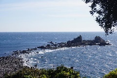 岬の先に浮かぶ三ツ石が半島のシンボルで、クスノキ、マツ、シイノキなどにおおわれ…