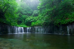湯川の源泉にある幅70m、落差3mの滝。湾曲した岩壁に、数百条の地下水が白糸の…